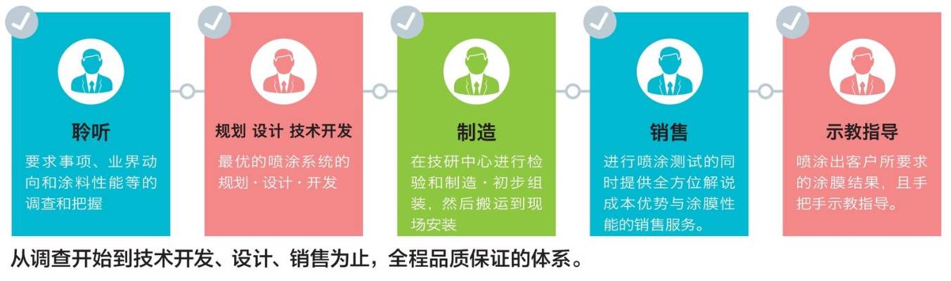 作為涂裝解決方案提供商,我們以解決客戶的要求、難題為出發點,從確認生產環境開始直至完成設計構想。試噴涂、制造、搬入安裝、然后進行噴涂生產。提供開發、制造、銷售等一條龍服務。